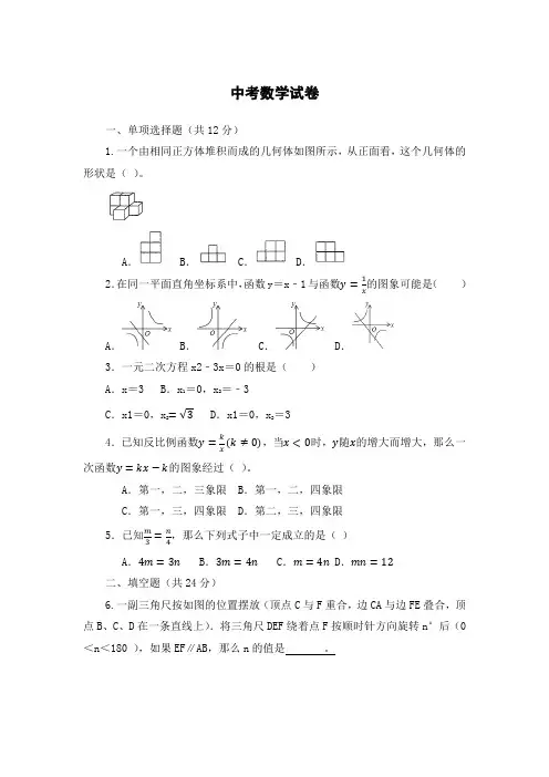 中考数学试卷一、单项选择题(共12分)1.一个由相同正方体堆积而成的几何体如图所示,从正面看,这个几何体的形状是()。
