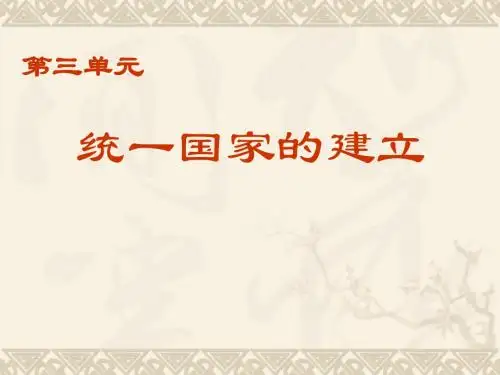 第三单元《统一国家的建立》教案一、教材分析《“秦王扫六和”》是第三单元《统一祖国的建立》首篇教学内容,根据历史新课程标准的内容,让学生了解秦兼并六国、实现国家的统一,建立起我国历史上第一个统一的多民族的中央集权国家以及秦始皇加强中央集权的史实,探讨统一国家建立的意义.使学生认识到秦的统一是历史发展的必然趋势,秦始皇是中国古代一位雄才大略的封建帝王.他所采取的一系列巩固统一的措施,对以后中国历史产生了深远的影响.因此,本节课在整个中国古代史中也占有十分重要的地位。