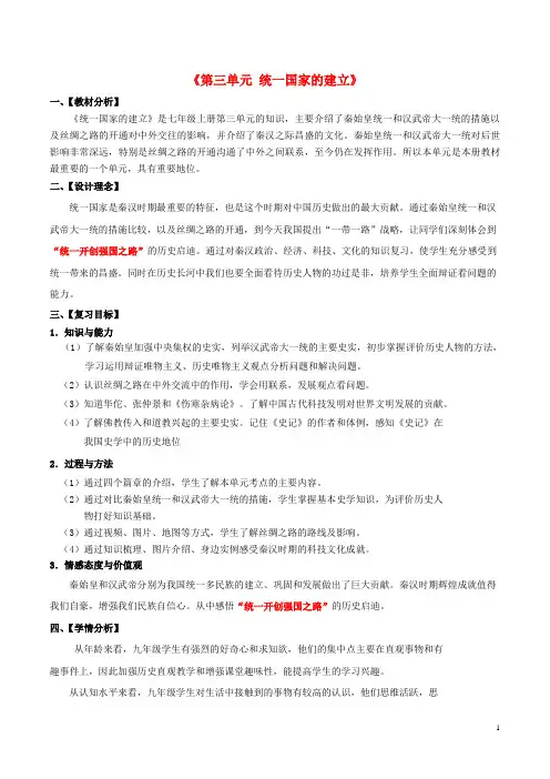《第三单元统一国家的建立》一、【教材分析】《统一国家的建立》是七年级上册第三单元的知识,主要介绍了秦始皇统一和汉武帝大一统的措施以及丝绸之路的开通对中外交往的影响,并介绍了秦汉之际昌盛的文化。