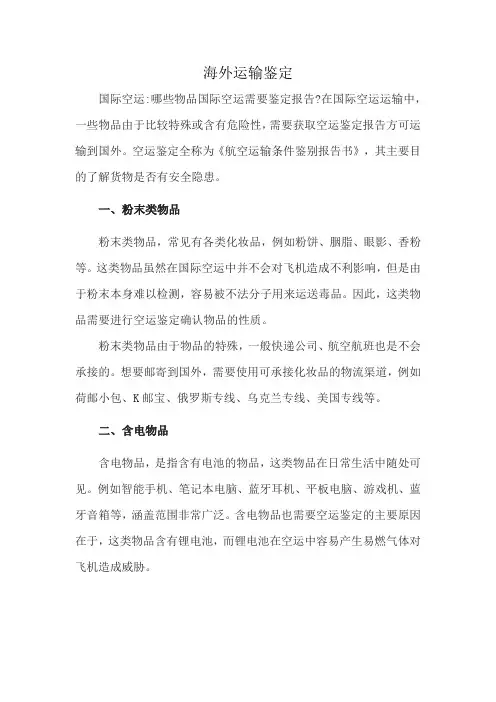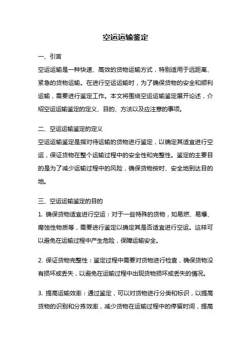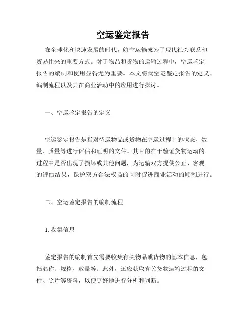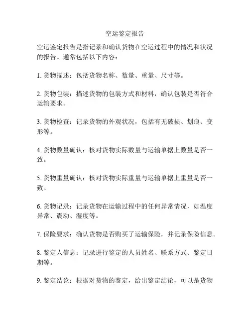 空运鉴定报告范文一、背景介绍空运鉴定是指在货物通过航空运输过程中,对货物进行鉴定、检测和评估,以确认货物的品质、数量和价值等,确保货物在运输过程中的安全和完整性。