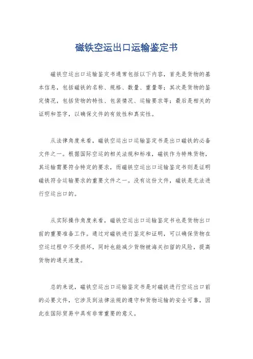 总的来说,磁铁空运出口运输鉴定书是对磁铁进行空运出口前的必要文件,它涉及到法律法规的遵守和货物运输的安全可靠,因此在国际贸易中具有非常重要的意义。