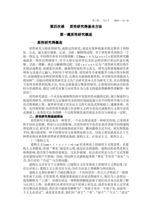 第三组:: 马江平2013—10—24第四次课质性研究得基本方法第一题质性研究概述一、质性研究得概念质性研究又称质得研究,或称定性研究,就是对某种现象在特定情形下得特征、方式、涵义进行观察、记录、分析、解释得过程。