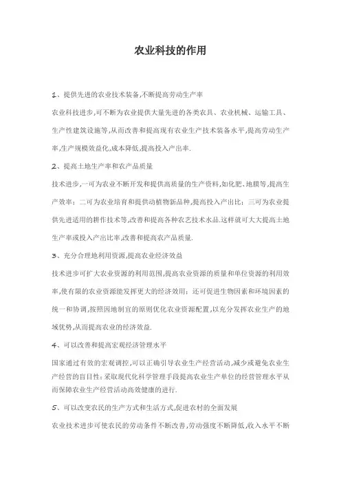 三、新技术方面1. 新技术推广应用取得突破近年来,我国农业新技术推广应用取得突破,为农业生产提供了有力保障。