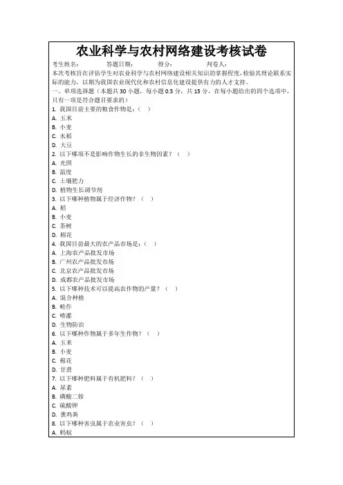 (四)试卷结构农村社会学考试内容占农业知识综合试卷内容的1/3,按照试卷总分150分计,农村社会学按50分设计试题结构。