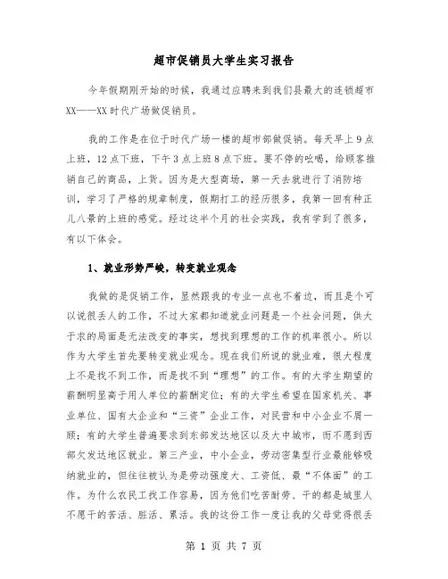 大学生商场促销员暑期社会实践报告7篇篇1一、实践背景与目的随着社会的快速发展,大学生暑期社会实践已成为提升自我认知社会、锻炼实践能力的重要途径。