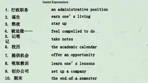 I have the power to nudge,to fan sparks,to suggest books,to oint out a pathway.动词不定式作宾语补足语修饰 power. Analysis复数形式:analysesv.analyse/analyze与其相似变化的词:basis-bases-baseparalysis 麻痹-paralyses-paralyse/paralyze 使麻痹 1.分析 2.分解 3.分析结果表,分析报告4.要略;梗概;纲领短语:in the final(或last, ultimate)analysis 总之,归根到底,说到底,结果,毕竟These are the real reasons I teach, these people who grow and change in front me. Being a teacher is begins present at the creation, when the clay beginsto breathe.”These are…in front me”这些是我缘何执教的真正原因,为的是这些在我面前成长和变化的人这两句话分别都是用了attributive clause来修饰reason和people.A "promotion" out of teaching would give me money and power. But I have m oney. I get paid to do what I enjoy: reading talking with people, and askin g questions like, "What is the point of being rich?"get paid to do what I enjoy 我通过做我喜欢的事情来得到报酬。
