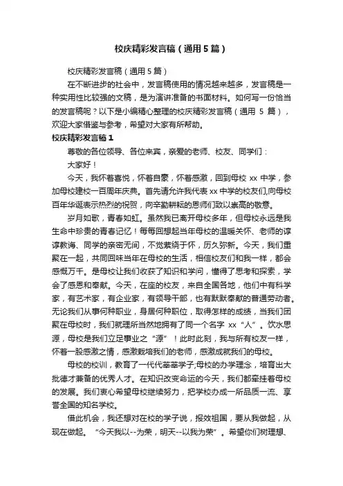 如何写一份恰当的发言稿呢?以下是小编精心整理的校庆精彩发言稿(通用5篇),欢迎大家借鉴与参考,希望对大家有所帮助。