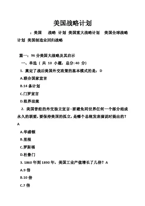 美国战略计划:美国战略计划美国重大战略计划美国全球战略计划美国制造业回归战略篇一:96分美国大战略及其启示一、单选( 共10 小题,总分: 40 分)1. 奠定了战后美国外交政策的基本模式的是:DA.联合国家宣言B.14条计划C.门罗宣言D.租界法案2. 美国曾经的外交独立宣言--要避免同世界任何一个部分结成永久的联盟,要保持美国的孤立,是哪个总统发表演说时提出的?AA.华盛顿B.里根C.罗斯福D.杜鲁门3. 1860年到1890年,美国工业产值增长了几倍?AA.9倍B.10倍C.7倍D.8倍4. 14条计划是美国开始为世界和平勾勒蓝图,要追求世界性的道义影响的一个标志,这个计划是由美国总统威尔逊在哪一年向国会提出的?AA.1918年B.1917年C.1916年D.1919年5. 1939年以来,美国的哪个总统将对外政策逐步转向英法,向英法倾斜,扩大了对英法的援助?CA.威尔逊B.杜鲁门C.罗斯福D.肯尼迪6. 当时英国得以称霸世界的王牌是BA.它的陆军力量B.它的海军力量C.它的经济实力D.它的军事实力7. 从1873年到1913年,美国的年经济平均增长率达到了多少?C A.0.1 B.0.07 C.0.05D.0.088. 克林顿上台之后,重点是解决美国的国内问题,尤其是它的BA.政治问题B.经济问题C.人口问题D.社会问题9. 19世纪70年代,美国超过哪个国家成为世界上最强大、最先进的经济体?DA.日本B.德国C.法国D.英国10. 从经济的角度上讲,美国经济是从什么时候开始迅速起飞,并走上了稳定的经济增长和工业化的历程? BA.19世纪60年代B.19世纪50年代C.19世纪70年代D.19世纪40年代二、多选( 共5 小题,总分: 20 分)1. 1947年6月,美国国务卿马歇尔提出了援助西方,实现西欧经济复兴的马歇尔计划,这个计划代表了BDA.美国正式建立世界霸权B.美国开始从建立世界霸权,转向巩固西方霸权,由建立全球自由主义的经济秩序,转而寻求特定的经济安排C.美国已经不满足于西方霸权,从而转向建立世界霸权D.美国霸权战略的转轨2. 关于威尔逊的14条计划,以下表述正确的有:ABCA.14条计划中最重要的一点就是威尔逊提议成立一个维护和平的国际组织B.14条计划是美国干预国际事务的首次表态C.14条计划是是美国争夺全球霸权的宣言D.14条计划体现了美国在国际交往中的单边外交原则3. 以下对战略的描述正确的有:ABCDA.战略概念古旧有知,中国古代称之为庙算、谋略、韬略、方略、兵略等B.最初在中国的战略文化中,战与略是分别使用的,前者指的是战斗,交战,战争,后者指的策划、策略、谋略等C.从西方来看,18世纪之前,西方学者和战略家并没有将战略和战术区分开来D.最初在中国的战略文化中,战与略是没有区分开来的,而西方学者和战略家将战和略分别使用4. 美国的战略历程包含几个主要阶段,分别是:ABCDA.霸权准备期B.霸权确立期C.霸权护持期D.霸权扩展期5. 关于美国世界霸权的确立表述正确的有:ABCDA.美国利用联合国等全球性政治组织,确立了全球的政治霸权地位B.美国利用世界经济的重建,确立了世界经济霸权地位C.美国通过与苏联的意识形态斗争,获得了西方精神领袖地位D.美国通过与苏联的军事对话,确保了军事霸权地位6.19世纪40年代中后期,美国在短短的四年之内,将几个地区320万平方公里的土地,纳入自己的版图,迅速成为两洋国家。