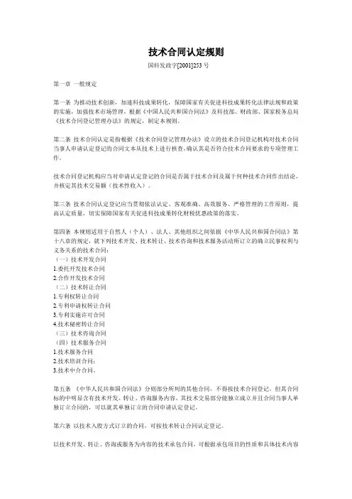 技术合同认定规则国科发政字[2001]253号第一章一般规定第一条为推动技术创新,加速科技成果转化,保障国家有关促进科技成果转化法律法规和政策的实施,加强技术市场管理,根据《中国人民共和国合同法》及科技部、财政部、国家税务总局《技术合同登记管理办法》的规定,制定本规则。
