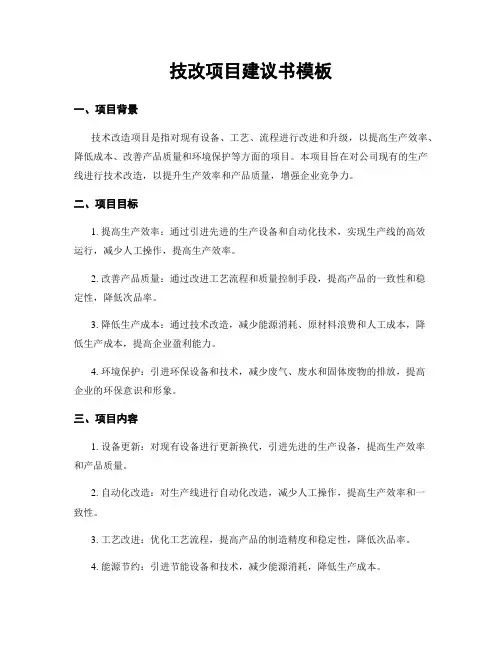 技改项目建议书模板一、项目背景技术改造项目是指对现有设备、工艺、流程进行改进和升级,以提高生产效率、降低成本、改善产品质量和环境保护等方面的项目。