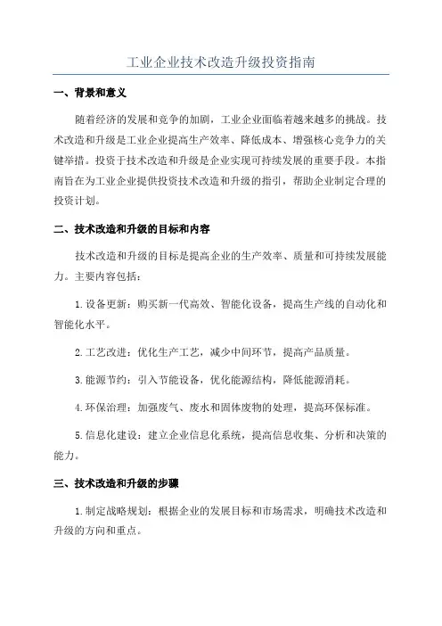 工业企业技术改造升级投资指南一、背景和意义随着经济的发展和竞争的加剧,工业企业面临着越来越多的挑战。