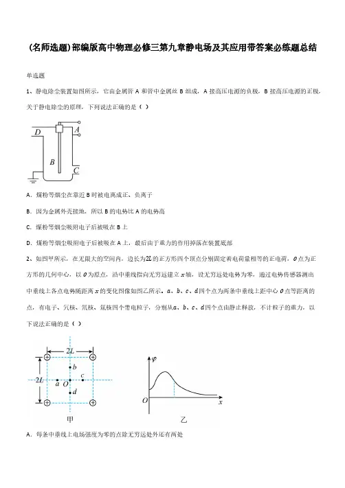 (名师选题)部编版高中物理必修三第九章静电场及其应用带答案必练题总结单选题1、静电除尘装置如图所示,它由金属管A和管中金属丝B组成,A接高压电源的负极,B接高压电源的正极,关于静电除尘的原理,下列说法正确的是()A.煤粉等烟尘在靠近B时被电离成正、负离子B.因为金属外壳接地,所以B的电势比A的电势高C.煤粉等烟尘吸附电子后被吸在B上D.煤粉等烟尘吸附电子后被吸在A上,最后由于重力的作用掉落在装置底部2、如图甲所示,在无限大的空间内,边长为2L的正方形四个顶点分别固定着电荷量相等的正电荷,O点为正方形的几何中心,以O为原点,沿中垂线指向无穷远建立x轴,设无穷远处电势为零,通过电势传感器测出中垂线上各点电势随距离x的变化图像如图乙所示。