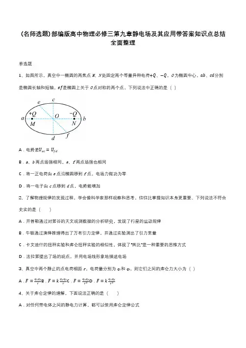 (名师选题)部编版高中物理必修三第九章静电场及其应用带答案知识点总结全面整理单选题1、如图所示,真空中一椭圆的两焦点M、N处固定两个等量异种电荷+Q、−Q,O为椭圆中心,ab、cd分别是椭圆长轴和短轴,ef是椭圆上关于O点对称的两个点,下列说法中正确的是()A.电势差U ec=U fdB.a、b两点场强相同,e、f两点场强也相同C.将一正电荷由e点沿椭圆移到f点,电场力做功为零D.将一电子由c点移到d点,电势能增加2、了解物理规律的发现过程,学会像科学家那样观察和思考,往往比掌握知识本身更重要。