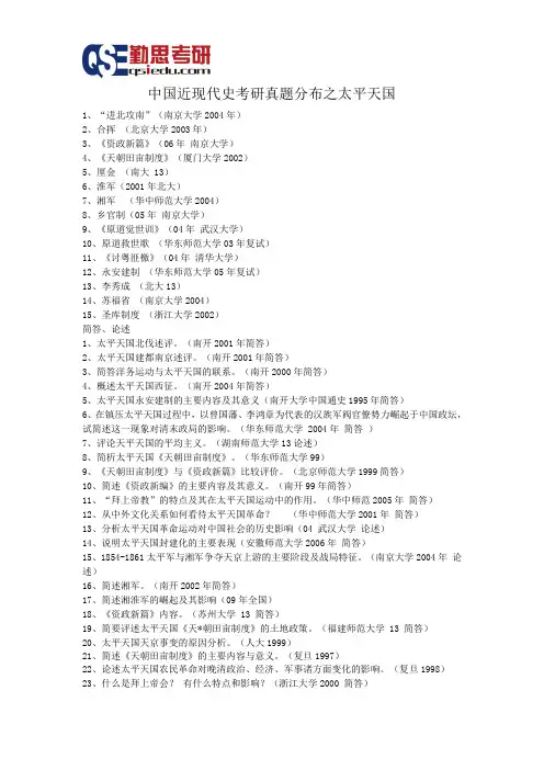 (华中师范2005年简答)12、从中外文化关系如何看待太平天国革命?(华中师范大学2001年简答)13、分析太平天国革命运动对中国社会的历史影响(04 武汉大学论述)14、说明太平天国封建化的主要表现(安徽师范大学2006年简答)15、1854-1861太平军与湘军争夺天京上游的主要阶段及战局特征。