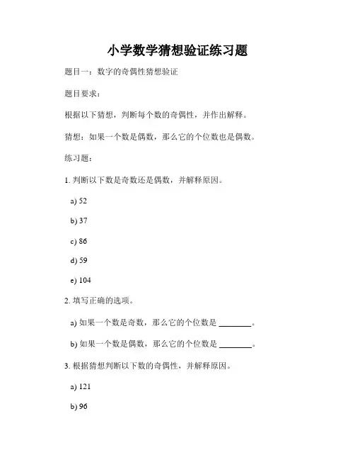 小学数学猜想验证练习题题目一:数字的奇偶性猜想验证题目要求:根据以下猜想,判断每个数的奇偶性,并作出解释。