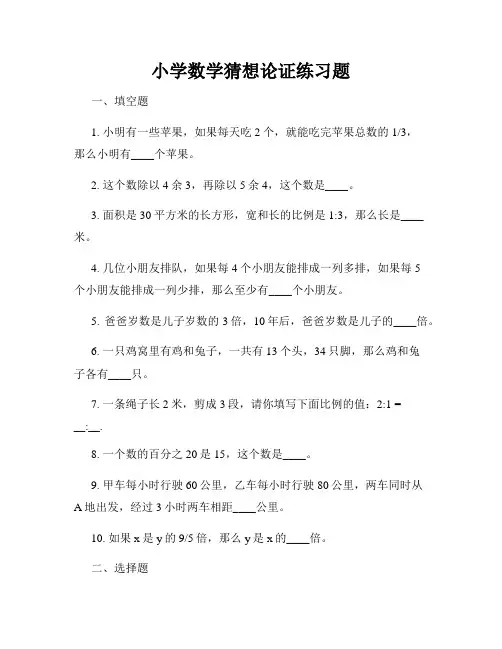 小学数学猜想论证练习题一、填空题1. 小明有一些苹果,如果每天吃2个,就能吃完苹果总数的1/3,那么小明有____个苹果。