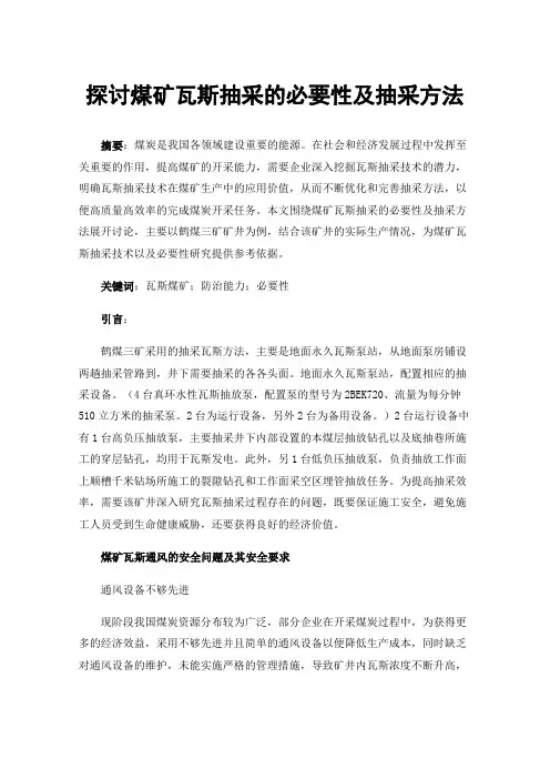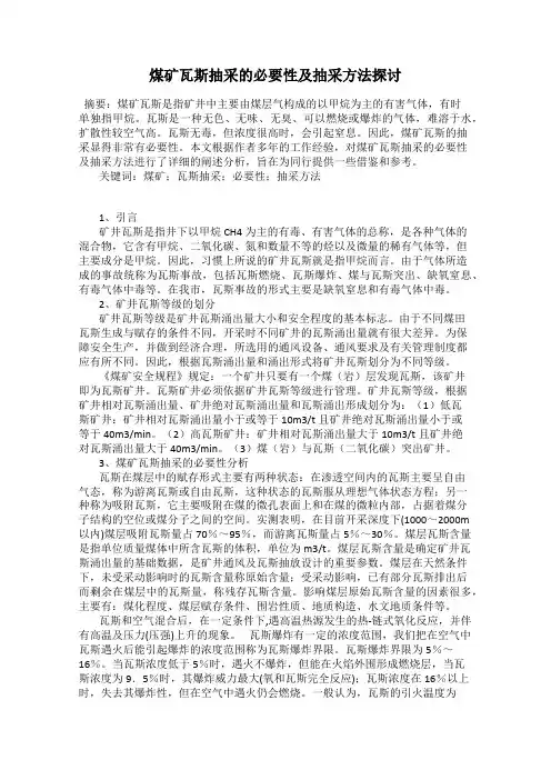一、煤矿瓦斯抽采的必要性煤矿瓦斯在煤矿中的积聚,一方面容易导致瓦斯爆炸事故的发生,另一方面也会对矿工身体健康造成危害。
