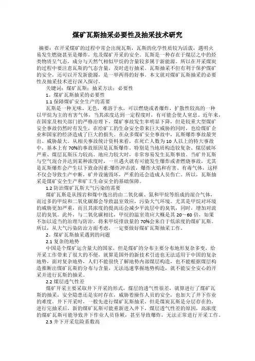 二、煤矿瓦斯抽采的必要性2.1 保障矿工生命安全通过对瓦斯进行抽采,可以有效的降低矿井的瓦斯浓度,减少瓦斯引发的事故率,保障矿工的生命安全。