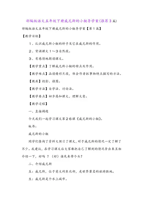 部编版语文五年级下册威尼斯的小艇导学案(精推3篇)〖部编版语文五年级下册威尼斯的小艇导学案第【1】篇〗一、教学目标:1、使学生了解威尼斯小艇的特点,懂得它和这座水上城市的关系。