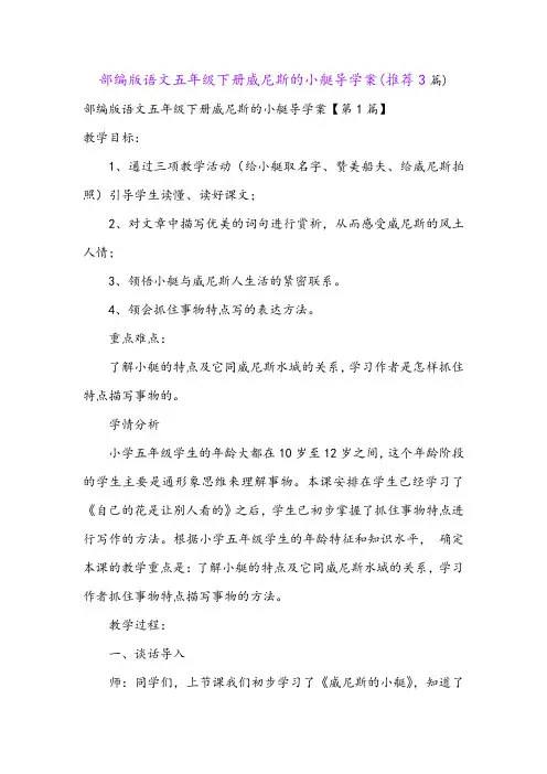 部编版语文五年级下册威尼斯的小艇导学案(精选3篇)〖部编版语文五年级下册威尼斯的小艇导学案第【1】篇〗教学目的:1、通过学习课文,了解威尼斯独特的地理风貌、小艇的特点及它同威尼斯水城的关系,受到热爱大自然与热爱生活的教育。