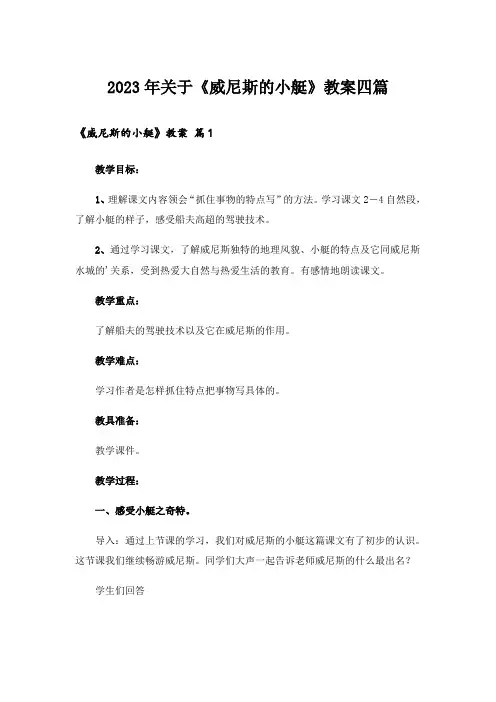 教学过程:一、谈话导入师:同学们,上节课我们初步学习了《威尼斯的小艇》,知道了威尼斯是个很美丽的城市,而小艇是威尼斯人主要的交通工具,这一节课,让我们一起再次走进威尼斯,走近小艇,深入地了解威尼斯的小艇。
