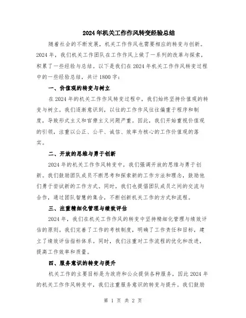 以下是我们在2024年机关工作作风转变过程中的一些经验总结,共计1800字:一、价值观的转变与树立在2024年的机关工作作风转变过程中,我们始终坚持价值观的转变与树立。