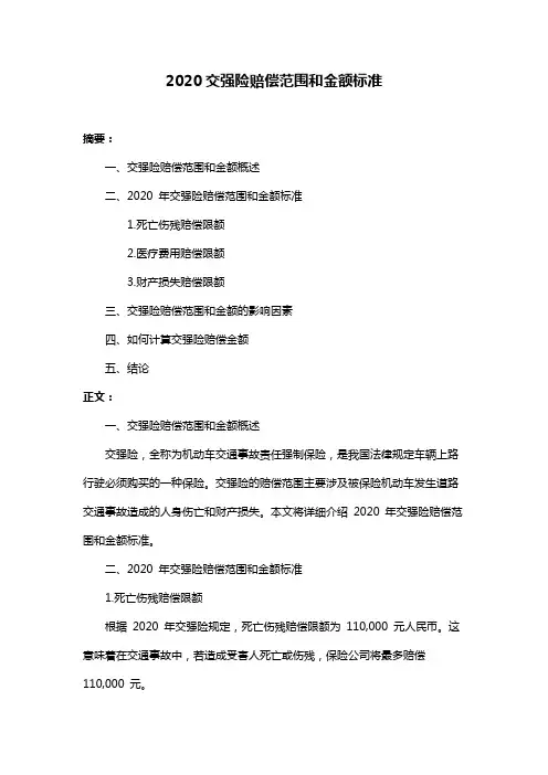 交强险赔偿范围交强险的赔偿范围指的是发生交通事故后,保险公司承担赔偿责任的程度,一般来说,交强险的赔偿范围包括以下三个方面:一、伤害责任:指因发生交通事故而造成的人身伤害赔偿。