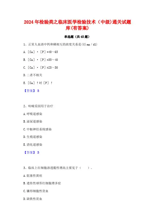 2024年检验类之临床医学检验技术(中级)通关试题库(有答案)单选题(共45题)1、正常人血清中钙和磷相互的浓度关系是(以mg/d1)A.[Ca]·[P]=40~65B.[Ca]·[P]=35~40C.[Ca]·[P]=25~30D.二者不相关E.[Ca]↑时[P]↑【答案】 B2、呋喃妥因用于治疗A.呼吸道感染B.泌尿道感染C.中枢神经系统感染D.生殖道感染E.消化道感染【答案】 B3、临床上红细胞渗透脆性增高主要见于()。