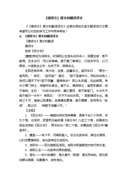 《强项令》原文和翻译译文《《强项令》原文和翻译译文》这是优秀的文言文翻译译文文章,希望可以对您的学习工作中带来帮助!1、《强项令》原文和翻译译文《强项令》原文和翻译强项令选自《后汉书》[董宣]特征为洛阳令。