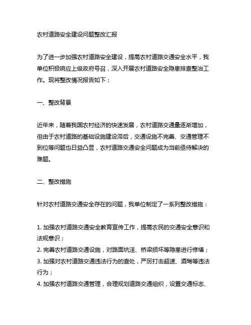 道路安全检查整改情况汇报根据上级要求,我单位对道路安全进行了全面检查,并对存在的问题进行了整改。