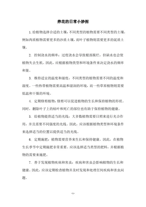 几种养花小技巧1、怎样判断盆花是否缺水(1)敲击法:用手指关节部位轻轻敲击花盆上中部盆壁,如发出比较清脆的声音,表示盆土已干,需立即浇水;若发出沉闷的浊音,表示盆土潮湿,可暂不浇水。