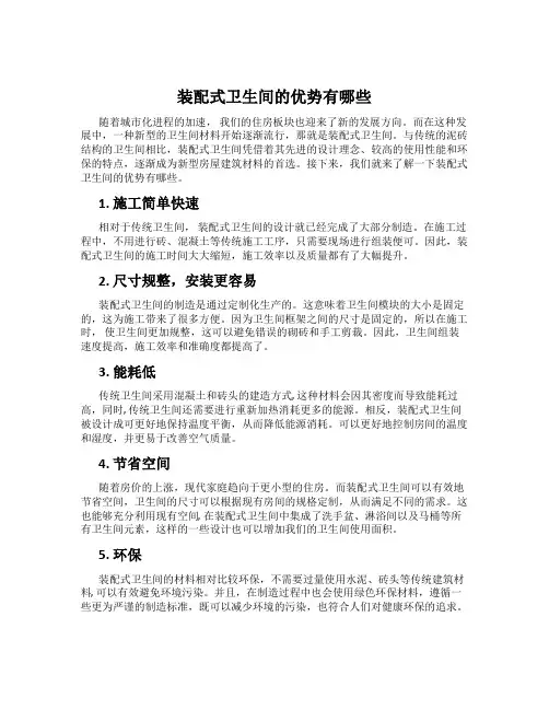 3. 提高装配式建筑的整体性和美观度在整体卫浴的设计中,卫浴构件的材质、颜色、样式等都是统一的,因此整个卫浴空间的整体性和美观度都有所提高。