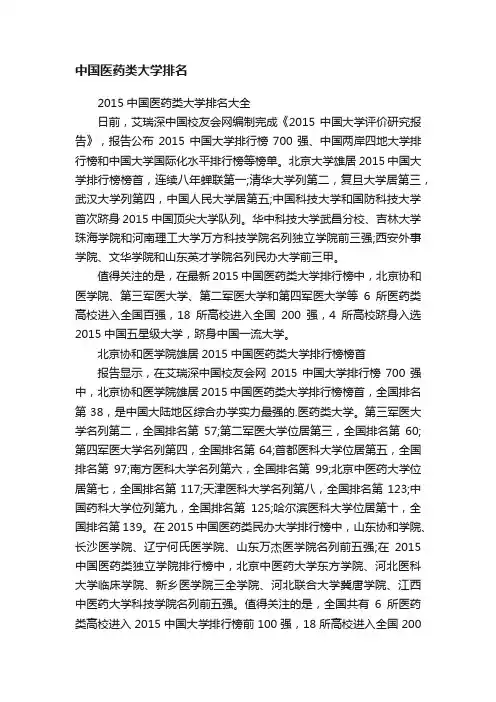 中国医药类大学排名2015中国医药类大学排名大全日前,艾瑞深中国校友会网编制完成《2015中国大学评价研究报告》,报告公布2015中国大学排行榜700强、中国两岸四地大学排行榜和中国大学国际化水平排行榜等榜单。