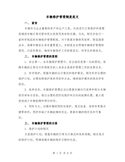 公司车辆维修管理规定范文一、引言本规定旨在规范公司车辆维修管理流程,确保车辆正常运行和延长车辆使用寿命。
