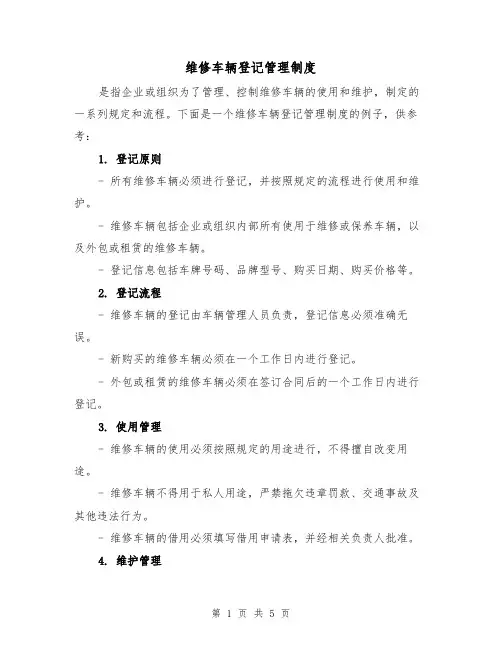 下面是一个维修车辆登记管理制度的例子,供参考:1. 登记原则- 所有维修车辆必须进行登记,并按照规定的流程进行使用和维护。