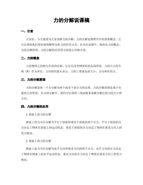 力的分解说课稿一、教学目标通过本节课的学习,学生应能够:1. 理解力的分解的概念和原理;2. 掌握力的分解的方法和步骤;3. 运用力的分解解决实际问题;4. 培养学生的观察力、分析能力和解决问题的能力。