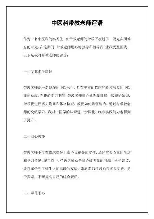 对带教教师评语篇一:带教老师评价1.带教老师具有良好的教学风范:是学生的榜样,教师的一言一行、一举一动都对我们有直接的影响。