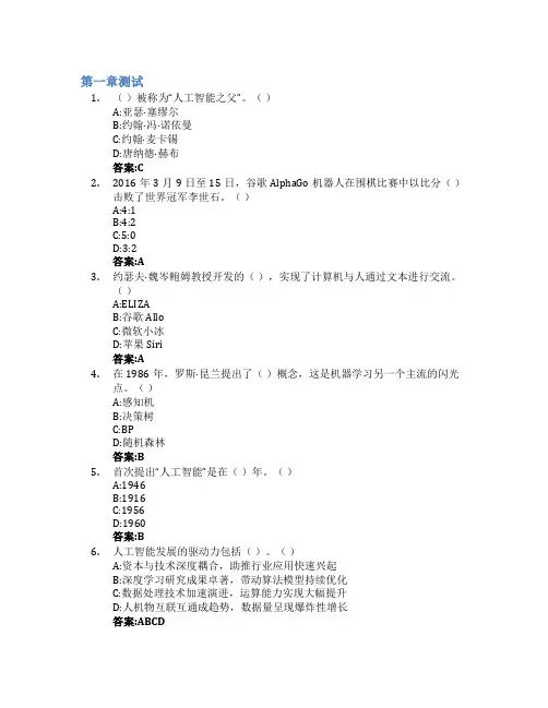 ()A:1946B:1916C:1956D:1960答案:B6.人工智能发展的驱动力包括()。