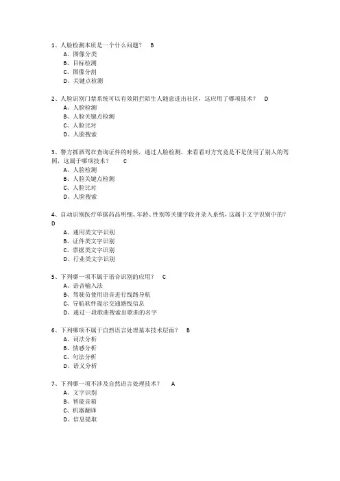 1、人脸检测本质是一个什么问题?BA、图像分类B、目标检测C、图像分割D、关键点检测2、人脸识别门禁系统可以有效阻拦陌生人随意进出社区,这应用了哪项技术?DA、人脸检测B、人脸关键点检测C、人脸比对D、人脸搜索3、警方抓酒驾在查询证件的时候,通过人脸检测,来看看对方究竟是不是使用了别人的驾照,这属于哪项技术?CA、人脸检测B、人脸关键点检测C、人脸比对D、人脸搜索4、自动识别医疗单据药品明细、年龄、性别等关键字段并录入系统,这属于文字识别中的?DA、通用类文字识别B、证件类文字识别C、票据类文字识别D、行业类文字识别5、下列哪一项不属于语音识别的应用?CA、语音输入法B、驾驶员使用语音进行线路导航C、导航软件提示交通路线信息D、通过一段歌曲搜索出歌曲的名字6、下列哪项不属于自然语言处理基本技术层面?BA、词法分析B、情感分析C、句法分析D、语义分析7、下列哪一项不涉及自然语言处理技术?AA、文字识别B、智能音箱C、机器翻译D、信息提取8、哪种对话机器人能精确理解对话意图,提取关键信息,可用于智能话务,智能硬件?BA、智能问答机器人B、话务机器人C、智能质检9、楼宇对讲系统属于智慧城市中哪一项内容?AA、智慧社区B、智慧便民设施C、智慧医疗D、智慧教育10、自动文摘有4种主要的方法,其中_______只对有用的文本片段进行有限深度的分析,其效率和灵活性显著提高。