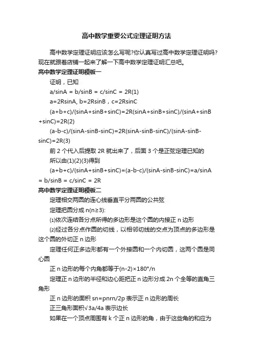 高中数学定理证明模板一证明,已知a/sinA = b/sinB = c/sinC = 2R(1)a=2RsinA, b=2RsinB,c=2RsinC(a+b+c)/(sinA+sinB+sinC)=2R(sinA+sinB+sinC)/(sinA+sinB +sinC)=2R(2)(a-b-c)/(sinA-sinB-sinC)=2R(sinA-sinB-sinC)/(sinA-sinB-sinC)=2R(3)前2个代入后提取2R就出来了,后面3个是正弦定理已知的所以由(1)(2)(3)得到(a+b+c)/(sinA+sinB+sinC)=(a-b-c)/(sinA-sinB-sinC)=a/sinA = b/sinB = c/sinC = 2R高中数学定理证明模板二定理相交两圆的连心线垂直平分两圆的公共弦定理把圆分成n(n≥3):⑴依次连结各分点所得的多边形是这个圆的内接正n边形⑵经过各分点作圆的切线,以相邻切线的交点为顶点的多边形是这个圆的外切正n边形定理任何正多边形都有一个外接圆和一个内切圆,这两个圆是同心圆正n边形的每个内角都等于(n-2)×180°/n定理正n边形的半径和边心距把正n边形分成2n个全等的直角三角形正n边形的面积sn=pnrn/2p表示正n边形的周长正三角形面积√3a/4a表示边长如果在一个顶点周围有k个正n边形的角,由于这些角的和应为360°,因此k×(n-2)180°/n=360°化为(n-2)(k-2)=4弧长计算公式:l=nπr/180扇形面积公式:s扇形=nπr2/360=lr/2内公切线长=d-(r-r)外公切线长=d-(r+r)等腰三角形的两个底脚相等等腰三角形的顶角平分线、底边上的中线、底边上的高相互重合如果一个三角形的两个角相等,那么这两个角所对的边也相等三条边都相等的三角形叫做等边三角形高中数学定理证明模板三数学公式抛物线:y = ax *+ bx + c就是y等于ax 的平方加上 bx再加上 ca > 0时开口向上a < 0时开口向下c = 0时抛物线经过原点b = 0时抛物线对称轴为y轴还有顶点式y = a(x+h)* + k就是y等于a乘以(x+h)的平方+k-h是顶点坐标的xk是顶点坐标的y一般用于求最大值与最小值抛物线标准方程:y^2=2px它表示抛物线的焦点在x的正半轴上,焦点坐标为(p/2,0) 准线方程为x=-p/2由于抛物线的焦点可在任意半轴,故共有标准方程y^2=2px y^2=-2px x^2=2py x^2=-2py圆:体积=4/3(pi)(r^3)面积=(pi)(r^2)周长=2(pi)r圆的标准方程 (x-a)2+(y-b)2=r2 注:(a,b)是圆心坐标圆的一般方程 x2+y2+Dx+Ey+F=0 注:D2+E2-4F>0(一)椭圆周长计算公式椭圆周长公式:L=2πb+4(a-b)椭圆周长定理:椭圆的周长等于该椭圆短半轴长为半径的圆周长(2πb)加上四倍的该椭圆长半轴长(a)与短半轴长(b)的差。