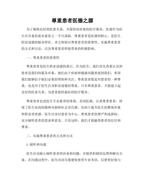 尊重患者医德之源为了确保良好的医患关系,并提供高质量的医疗服务,医德作为医生应具备的基本素质之一不可或缺。