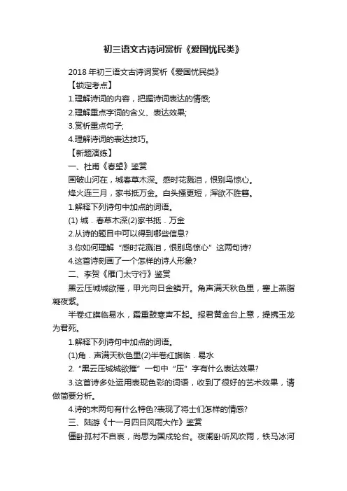 2018年初三语文古诗词赏析爱国忧民类》》年初三语文古诗词赏析《《爱国忧民类【锁定考点】1.理解诗词的内容,把握诗词表达的情感;2.理解重点字词的含义、表达效果;3.赏析重点句子;4.理解诗词的表达技巧。