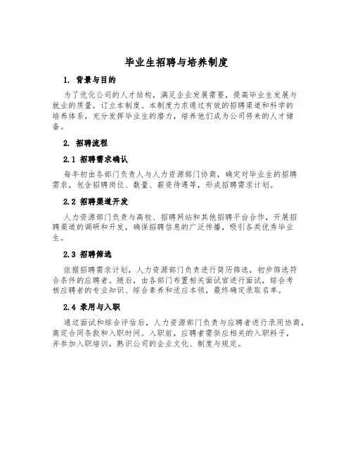 毕业生招聘与培养制度1. 背景与目的为了优化公司的人才结构,满足企业发展需要,提高毕业生发展与就业的质量,订立本制度。