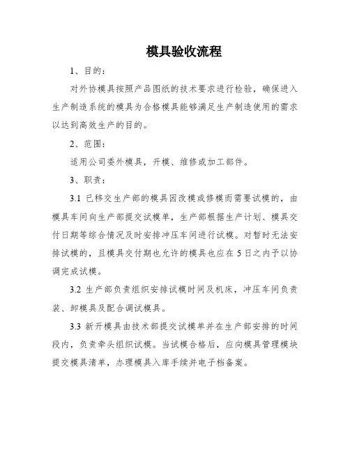 2.定义2.1.1试模之目的是为了确认新开模具的外观尺寸及工艺要求是否符合设计之要求。