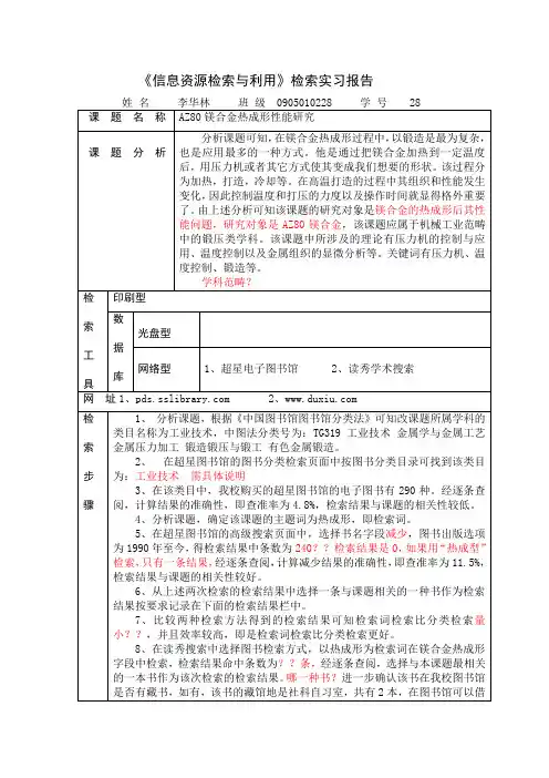 《信息资源检索与利用》检索实习报告姓名李华林班级 0905010228 学号 28 课题名称AZ80镁合金热成形性能研究课题分析分析课题可知,在镁合金热成形过程中,以锻造是最为复杂,也是应用最多的一种方式。