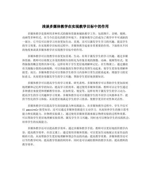 浅谈多媒体教学在实现教学目标中的作用多媒体教学是指利用影像、声音、文字、动画等多种媒体技术手段来辅助教学,提供多样化的教育资源和学习环境。