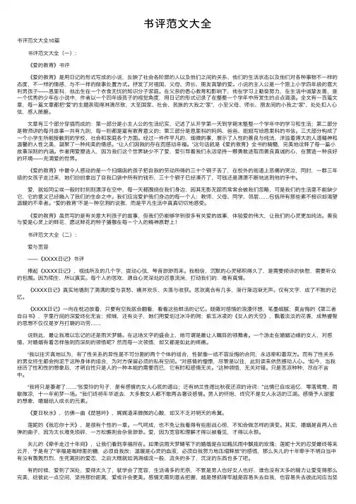 书评范⽂⼤全书评范⽂⼤全10篇 书评范⽂⼤全(⼀): 《爱的教育》书评 《爱的教育》是⽤⽇记的形式写成的⼩说,反映了社会各阶层的⼈以及他们之间的关系、他们的⽣活状态以及他们对各种事物不⼀样的态度,不⼀样的情感,与不⼀样的做事处置⽅式。