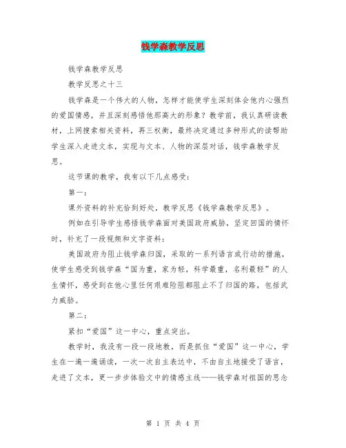 《钱学森》教学反思1一、品读感悟,激发情感注重阅读品味,是本课教学的精髓所在。