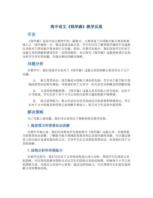 高中语文《钱学森》教学反思引言《钱学森》是高中语文教材中的一篇散文,主要讲述了中国航空航天事业的奠基人之一钱学森的一生。