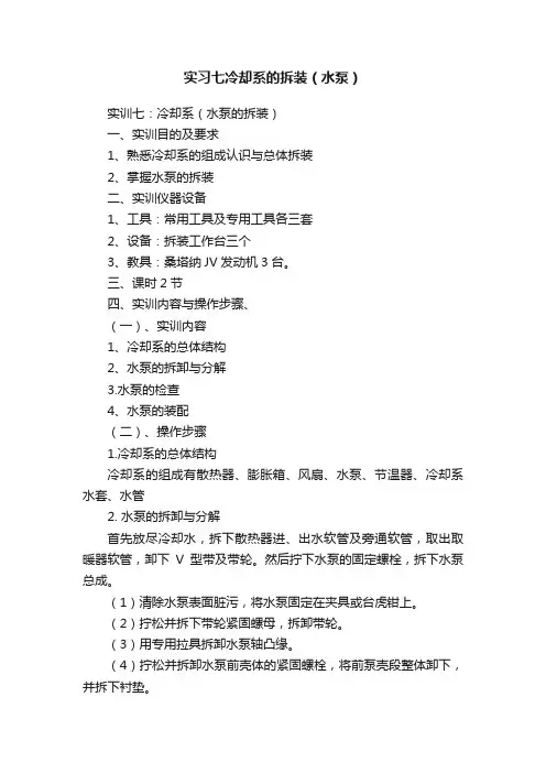 实习七冷却系的拆装(水泵)实训七:冷却系(水泵的拆装)一、实训目的及要求1、熟悉冷却系的组成认识与总体拆装2、掌握水泵的拆装二、实训仪器设备1、工具:常用工具及专用工具各三套2、设备:拆装工作台三个3、教具:桑塔纳JV发动机3台。